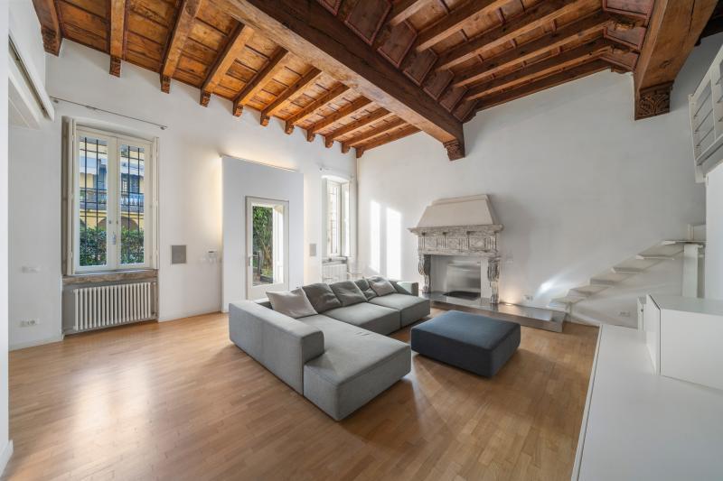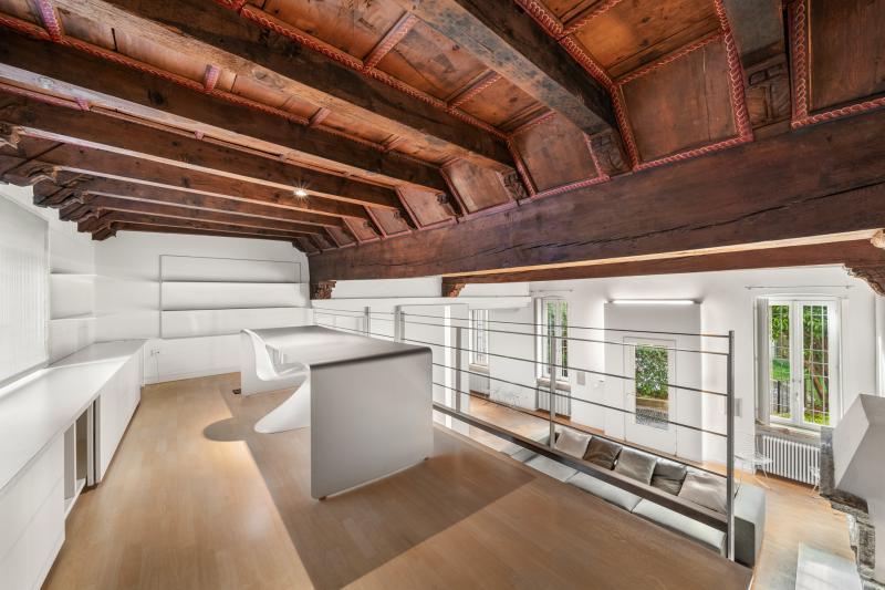 - Salone con travi a vista, camino in marmo e soppalco